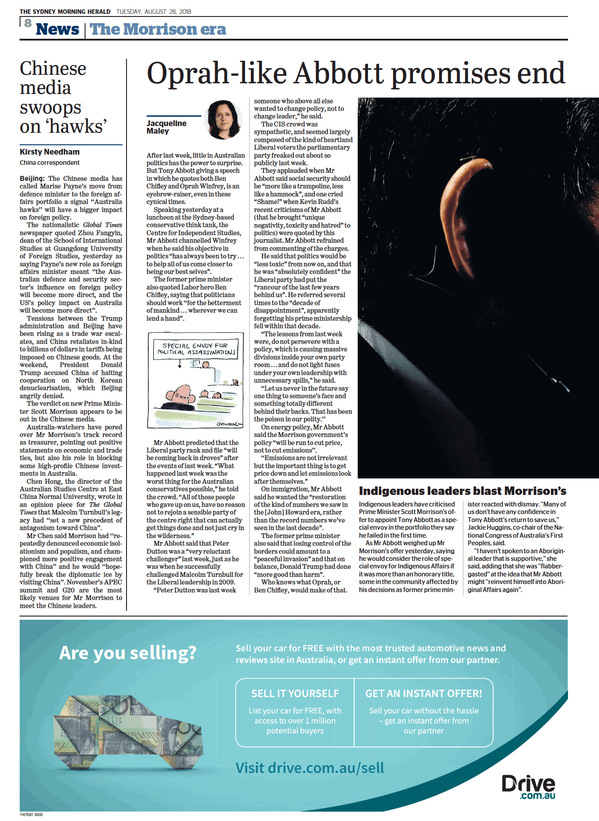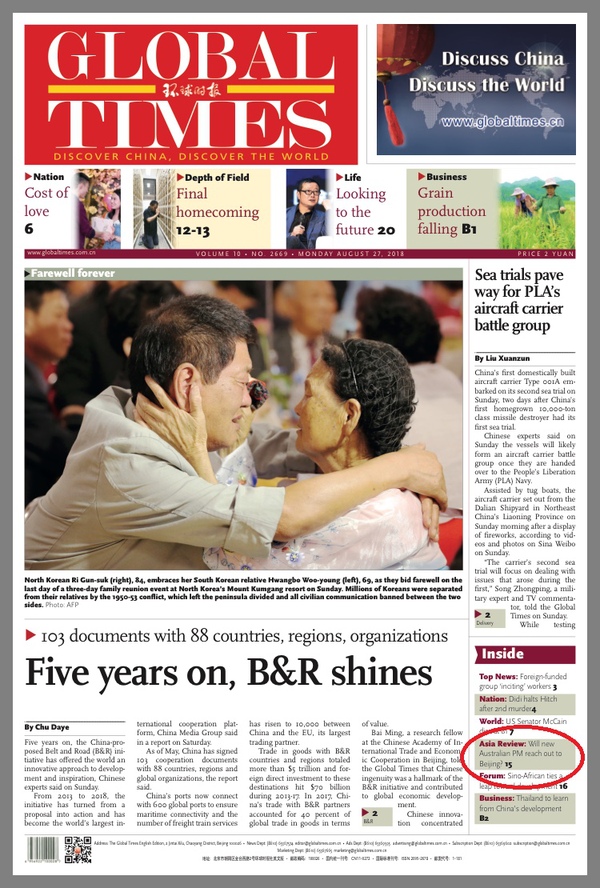 Over the past week, observers at this end of the Pacific have beenoverwhelmed and transfixed by the political drama unfolding in Canberra.Astounded to see two successive leadership spills within one week which broughtin the 30th prime minister of Australia, Scott Morrison, people here in Chinawere in fact still recovering from the disappointment and shock left by MalcolmTurnbull's administration to block Huawei from Australia's 5G wireless networkinfrastructure project. Turnbull has now exited through Canberra's everrevolving doors, but his legacy is ineffaceable, since it set a new precedentof antagonism toward China - even the US government hasn't imposed an officialban on a Chinese telecommunications provider.