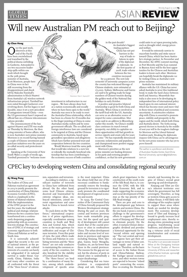 It would be extremely unwise to exacerbate hostility and stoke rancor toward China, which has been Australia's strategic partner. In November and December,the APEC summit meeting in Port Moresby and the G20 summit in Buenos Aires will be the best opportunities for the Chinese and Australian leaders to know each other. Morrison can hopefully break the diplomatic ice by visiting China as Australia's new prime minister.