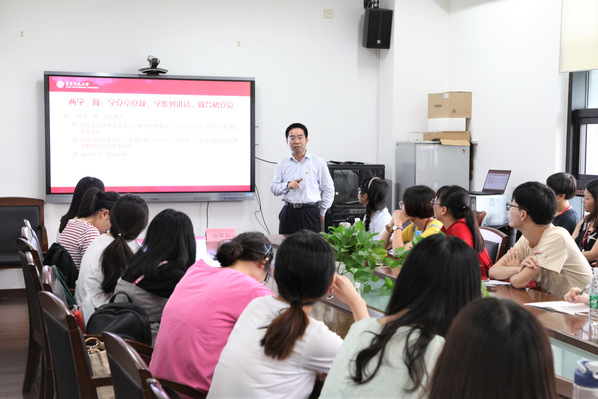 俞黎阳首先以华东师范大学党委书记童世骏的一篇名为《什么才是大学精神?请记住“ECNU”》的文章为开端,向在场的各位党员介绍了什么是“ECNU”精神。“ECNU”精神代表了一种现代的大学精神和理想,它的核心价值可以概括为12个词:创智、修德、爱群;规范、创新、交流;正直、向上、健全;卓越、公平、优雅。将之英译后得到了3个大写的ECNU: