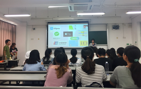 这次分享报告会主要围绕三个主题展开,分别是“中日经济”、“中日大学生就业”以及“中日社会文化”。横滨国立大学的学生首先介绍了中日两国支付方式。最让他们印象深刻的是中国人在消费购物时,更多选择简单、便捷的支付宝、微信等支付方式,而很少使用现金;而日本更为常见的则是现金支付和suica,Nanaco等卡片支付。