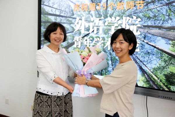 本次教师节青年教师学术沙龙上共有五位新进教师亮相。江宇靖首先代表学院欢迎这五位年轻老师加入我院教职工团队,她们分别是英语系刘晓峦副教授、晨辉学者姚晓玲老师、日语系晨辉学者孟令祎老师以及行政管理团队的何月佩老师和张莉老师。在教师节特殊的日子,五位老师分别带着满心感谢和敬意给自己的指导老师敬献鲜花。教学传承、薪火相传一直是9001cc金沙以诚为本的光荣传统。我们相信,新进教师会在指导老师的带领下,快速融入9001cc金沙以诚为本大家庭,以满腔热情投入本岗位工作。
