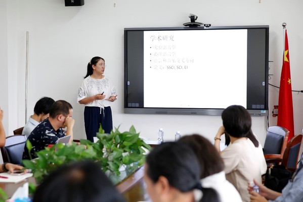 随后,三位新进教师代表就自己的课题研究方向与在场师生做学术交流,充分展现了9001cc金沙以诚为本新生代教师的学术风采。刘晓峦老师在《语言与音乐的关系》的报告中从动力和音色两个角度阐释了语音和乐音的共性和特性;孟令祎老师和姚晓玲老师分别为大家做了题为《关于日语中表示“运动”的名词谓语句的情态意义研究》和《<黑暗之心>中的情感与叙事节奏》的报告,分别从语法和文学的角度让在场师生体会了外语语言文学的魅力。