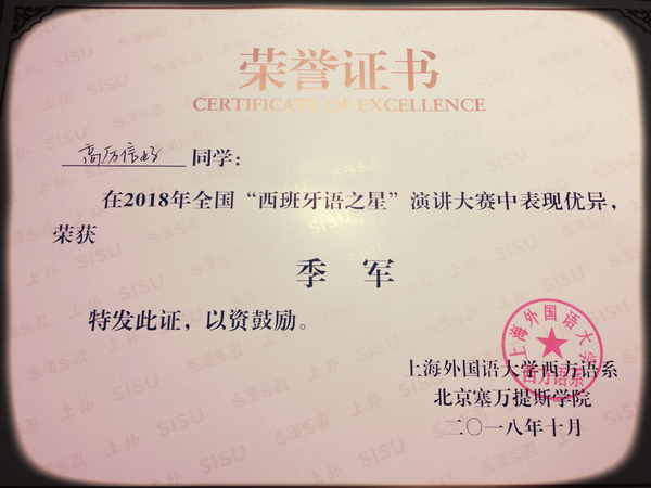 10月20日,2018年全国“西班牙语之星”演讲大赛在上海外国语大学松江校区举行。我院西班牙语专业大四学生高厉信好代表华东师范大学获得高年级组季军。