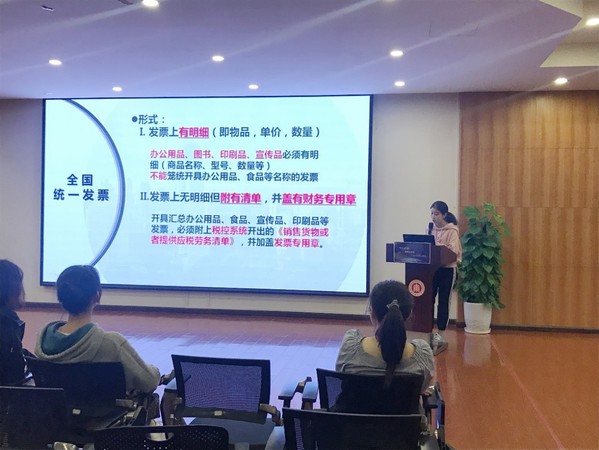 接下来,办公室的赵楠学姐讲解了学校的财务制度和学生会的财务管理细则,主要包括学生会的各项活动的报销流程、预算申请和决算等方面。讲述的全程细致生动,PPT内容也简洁易懂。