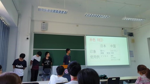 在于老师的一番介绍之后,日本学生们开始了他们精彩的发表。最先上场的是文化组。其中有的人对颜色的文化进行了中日比较,还有的人对上海与日本的建筑进行了比较与分析。
