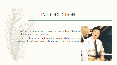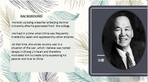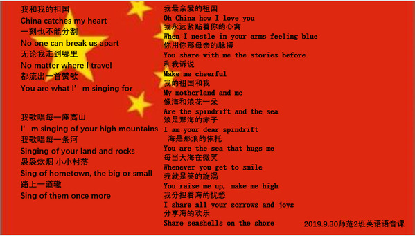 在这之前,同学们精心制作了有关《我和我的祖国》词曲作者的英文PPT,并在班内分享自己听后的感受。