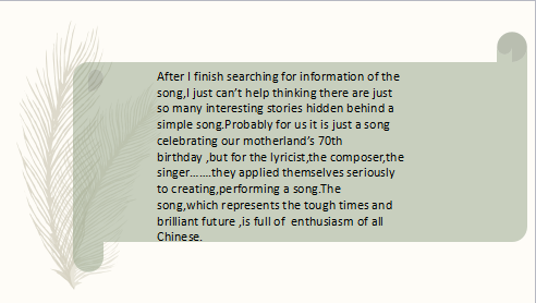 沈欣怡说:“After I finish searching for information of the song ,I just can’t help thinking there are just so many interesting stories hidden behind a simple song. Probably for us it is just a song celebrating our motherland’s 70th birthday ,but for the lyricist ,the composer ,the singer…….they applied themselves seriously to creating ,performing a song. The song, which represents the tough times and brilliant future ,is full of enthusiasm of all Chinese.”(通过了解这首歌的信息后,我不敢相信这首看似简单的歌曲背后竟有如此有趣的故事,对我们而言可能只是一首献礼祖国70岁生日的音乐,但是对于词曲作者乃至演唱者而言,他们的创作、表演过程是严肃、认真的。这首歌描绘了曾经的苦难岁月,也展望了光辉的未来,令人感到激动人心。)